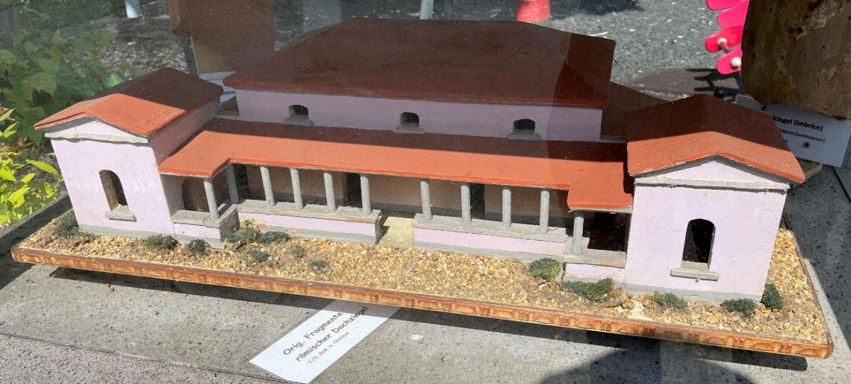 Die Torte mußte aber noch „verdient“ werden: Am Modell einer Römervilla und der Tafel 1 des Ortsrundgangs mit einer Darstellung der Geschichte und Genealogie der Herren der beiden Herrschaften von Sinzenich startete der Rundgang durch den Ort, der sich direkt neben der Hauptdurchfahrtsstraße bei strahlendem Sonnenschein als entzückend präsentierte.